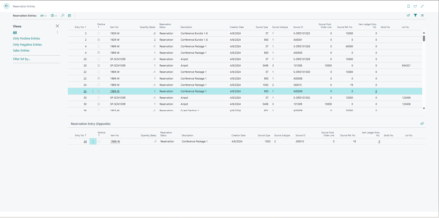 The Reservation Entries page gives you a complete overview of all outstanding Reservation Entries in your company.